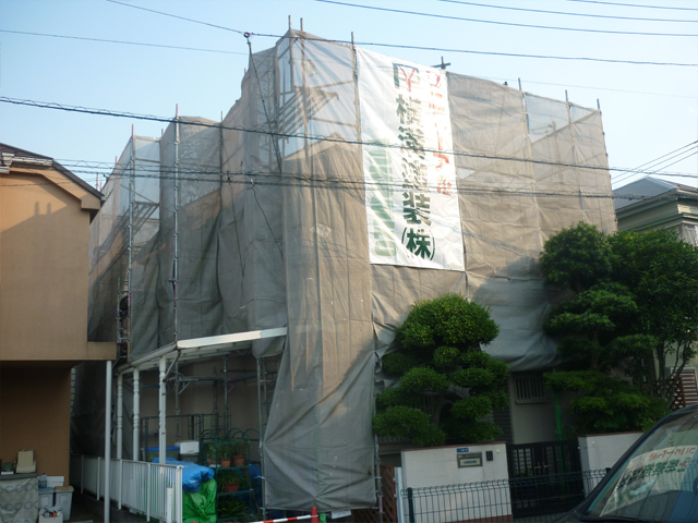 N邸。オーナー様と合議して、塗料材や色を決定し、施行しました。足場組立の際の様子も掲載しています。